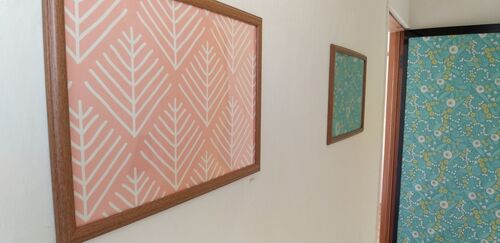 襖に利用した壁紙があまったのでフレームにいれてみました。 廊下の白い漆喰の壁に合わせてみると、いい感じのインテリアになりました。何もない壁もスッキリしていいのですが、フレームを飾ったら、頃合いのアクセントで気分転換にちょうどいいのです。北欧…
